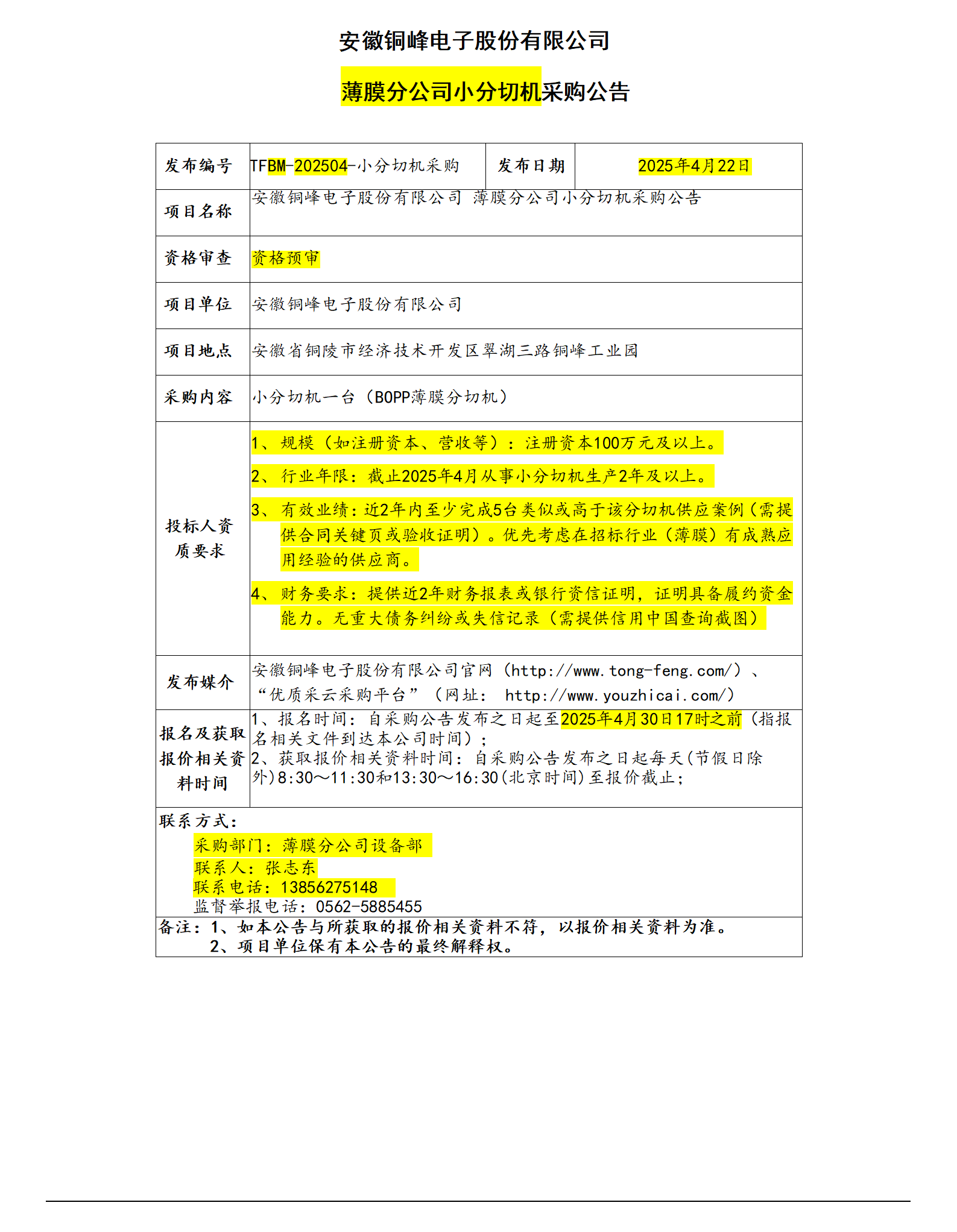 安徽銅峰電子股份有限公司—— 薄膜分公司小分切機采購公告_01