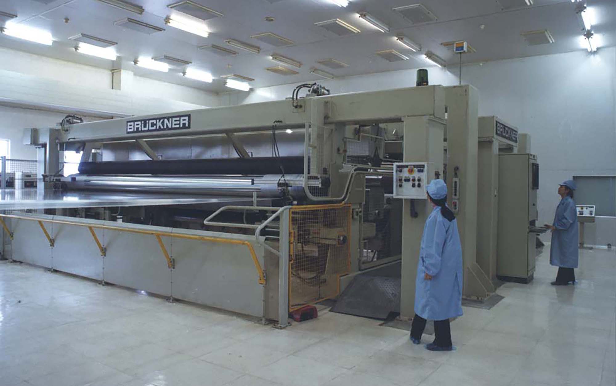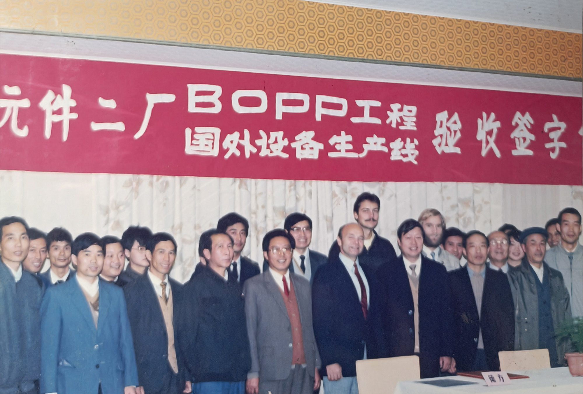 銅峰“老一線”于1989年建成投產(chǎn)。上世紀(jì)80年代,當(dāng)時(shí)國內(nèi)電容器用聚丙烯膜幾乎完全依賴進(jìn)口,嚴(yán)重制約了我國電容器等相關(guān)產(chǎn)業(yè)的發(fā)展。銅峰公司前身銅陵市無線電元件二廠積極響應(yīng)國家需求,決定從國外引進(jìn)雙向拉伸電容器用聚丙烯膜生產(chǎn)線。1985年項(xiàng)目啟動(dòng),經(jīng)過一系列籌備工作,1986年獲得國家計(jì)委批準(zhǔn)立項(xiàng),并被列入國家 “七五” 機(jī)械電子工業(yè)重點(diǎn)技改項(xiàng)目。1988年,主線和相關(guān)輔助設(shè)備成功引進(jìn)。經(jīng)過一年多的緊張建設(shè),1989年生產(chǎn)線正式投產(chǎn)?!袄弦痪€”的建成投產(chǎn),是銅峰發(fā)展史上具有重要意義的轉(zhuǎn)折點(diǎn)。該線加速了銅峰公司產(chǎn)品結(jié)構(gòu)調(diào)整和轉(zhuǎn)型步伐,并由此形成了全國唯一的“電工三膜”(電容薄膜、金屬化膜和薄膜電容器)一條龍的生產(chǎn)格局,使企業(yè)的經(jīng)濟(jì)規(guī)模和技術(shù)水平躍上一個(gè)新臺(tái)階。